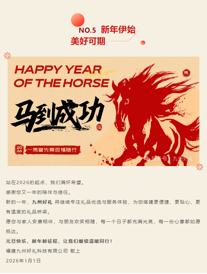 摘要:岁月更替,华章日新。在这辞旧迎新的美好时刻,福建九州好礼科技有限公司携全体员工,向一直支持与陪伴我们的您,致以最诚挚的节日问候!