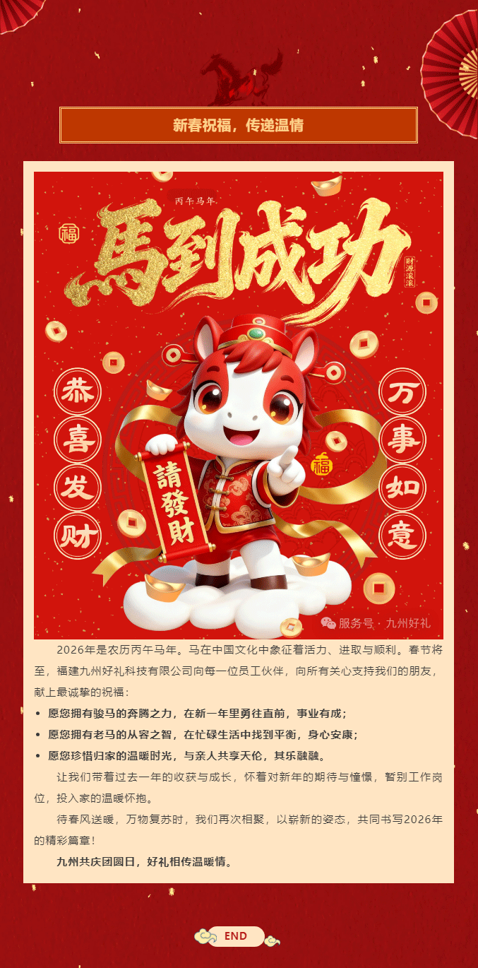 摘要:时光悄然流转,春节的脚步越来越近。在这辞旧迎新的美好时刻,九州好礼全体员工怀着感恩与喜悦的心情,提前向您送上最诚挚的新春祝福。