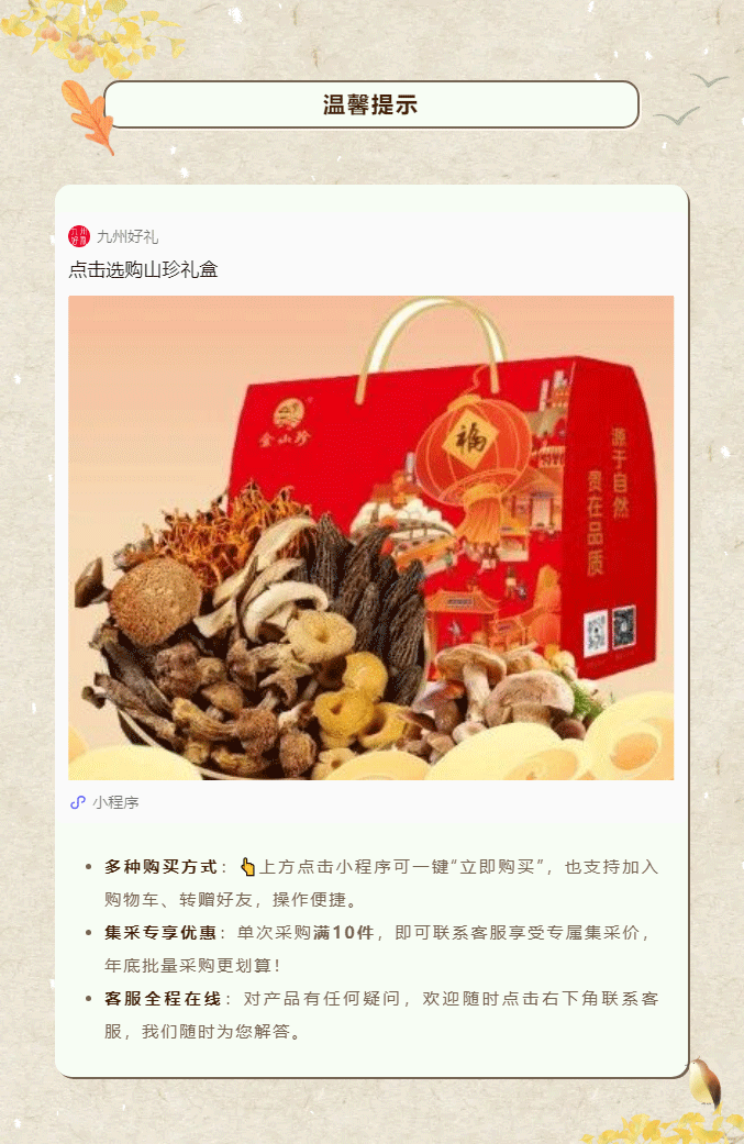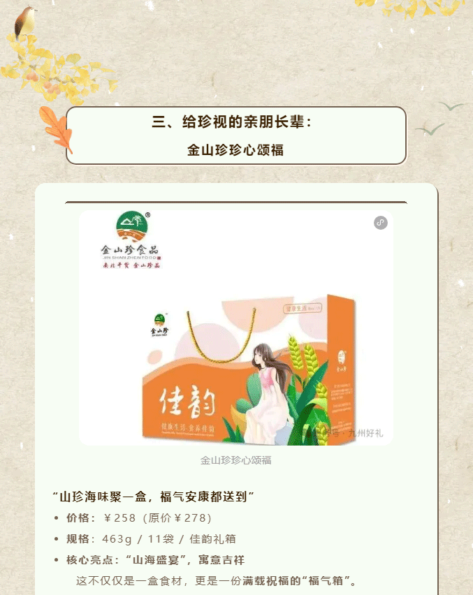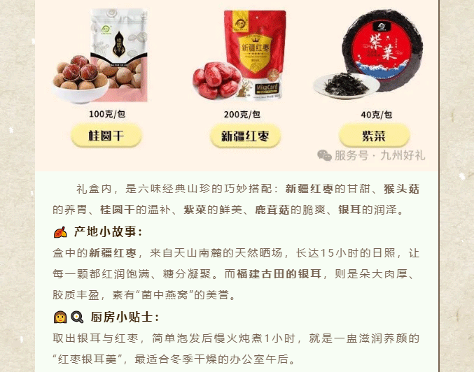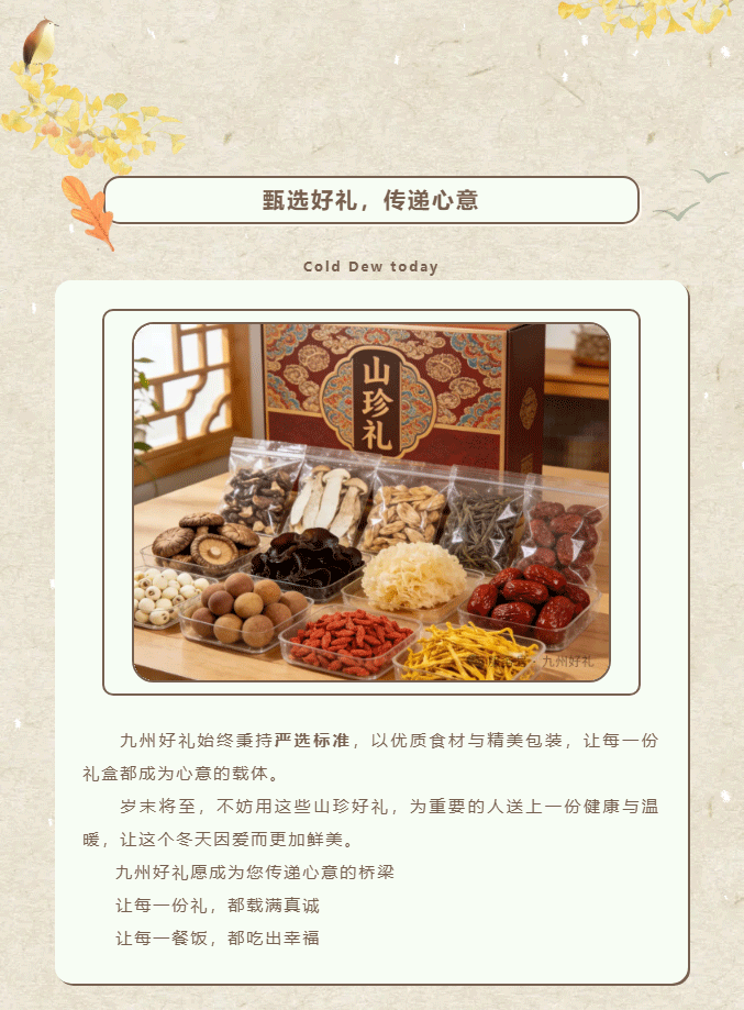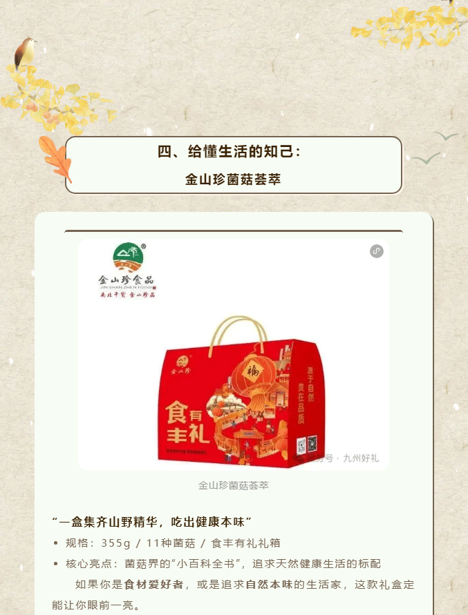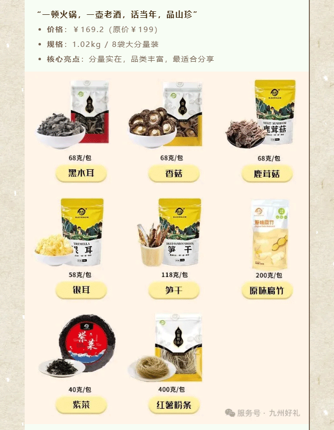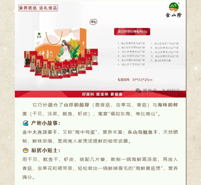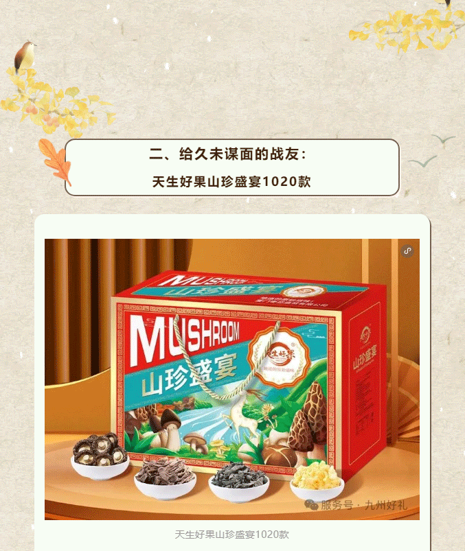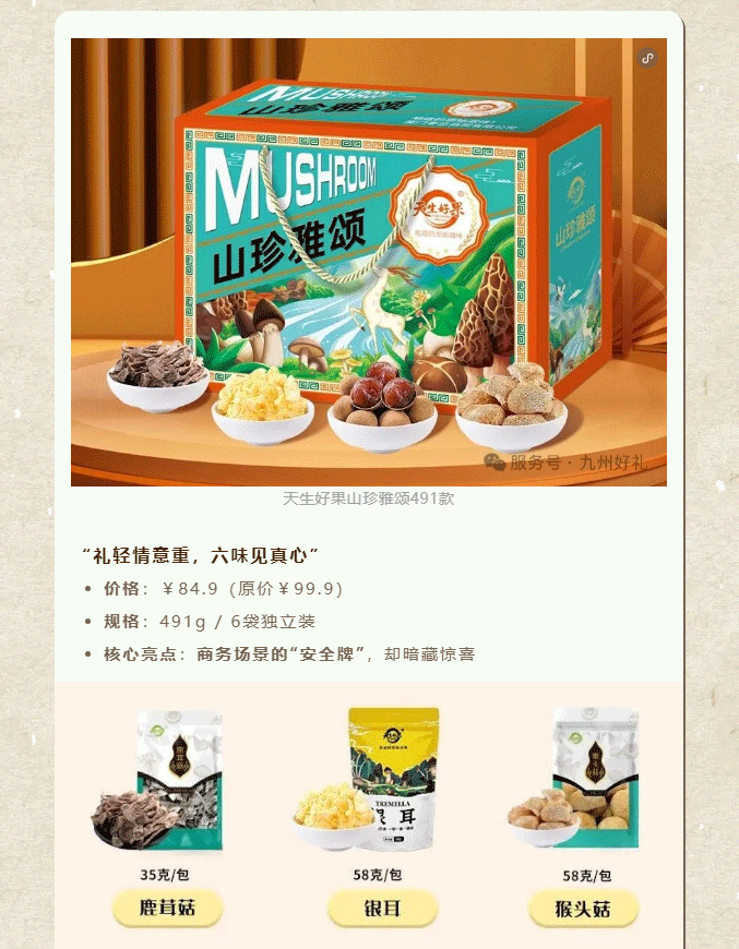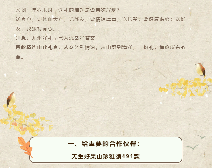 摘要:又到一年岁末时,送礼的难题是否再次浮现?送客户,要体面大方;送战友,要情谊厚重;送长辈,要健康贴心;送好友,要独特有心。别急,九州好礼早已为您备好答案——四款精选山珍礼盒,从商务到情谊,从山野到海洋,一份礼,懂你所有心意。